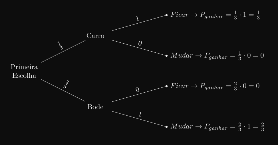 A probabilidade de escolhermos inicialmente o carro é de 1/3, e a de escolhermos um bode, de 2/3 consequentemente. A seguir, na segunda fase do desafio, temos que analisar os casos em que mudamos ou não de opinião. Para o caso de termos escolhido inicialmente o carro, se ficarmos, é certo que ganheremos, assim, a probabilidade condicional será de 1; por outro lado, se mudarmos de porta, acabamos por invariavelmente perder, ou seja, a probabilidade condicional de vitória é, então, nula.